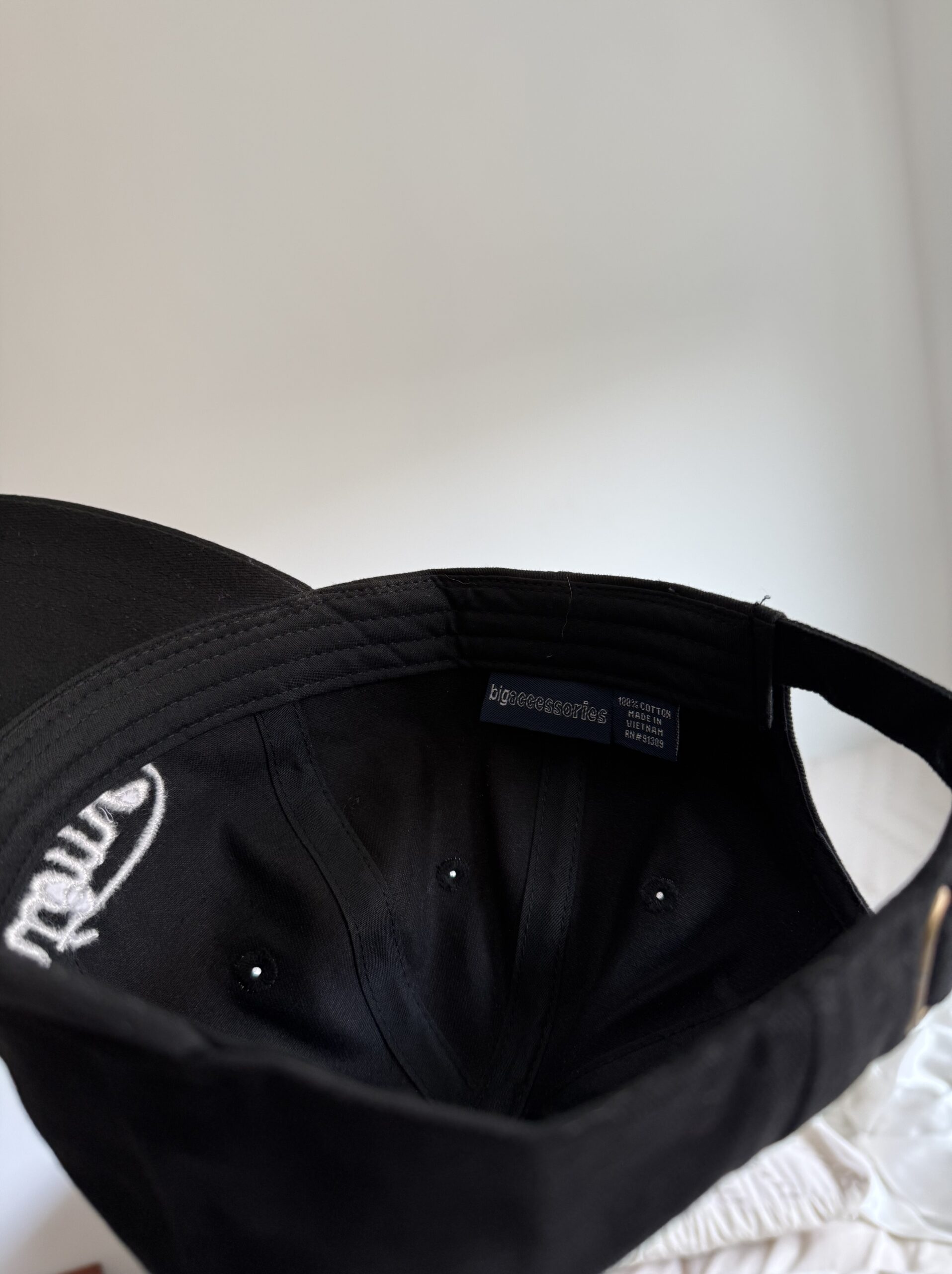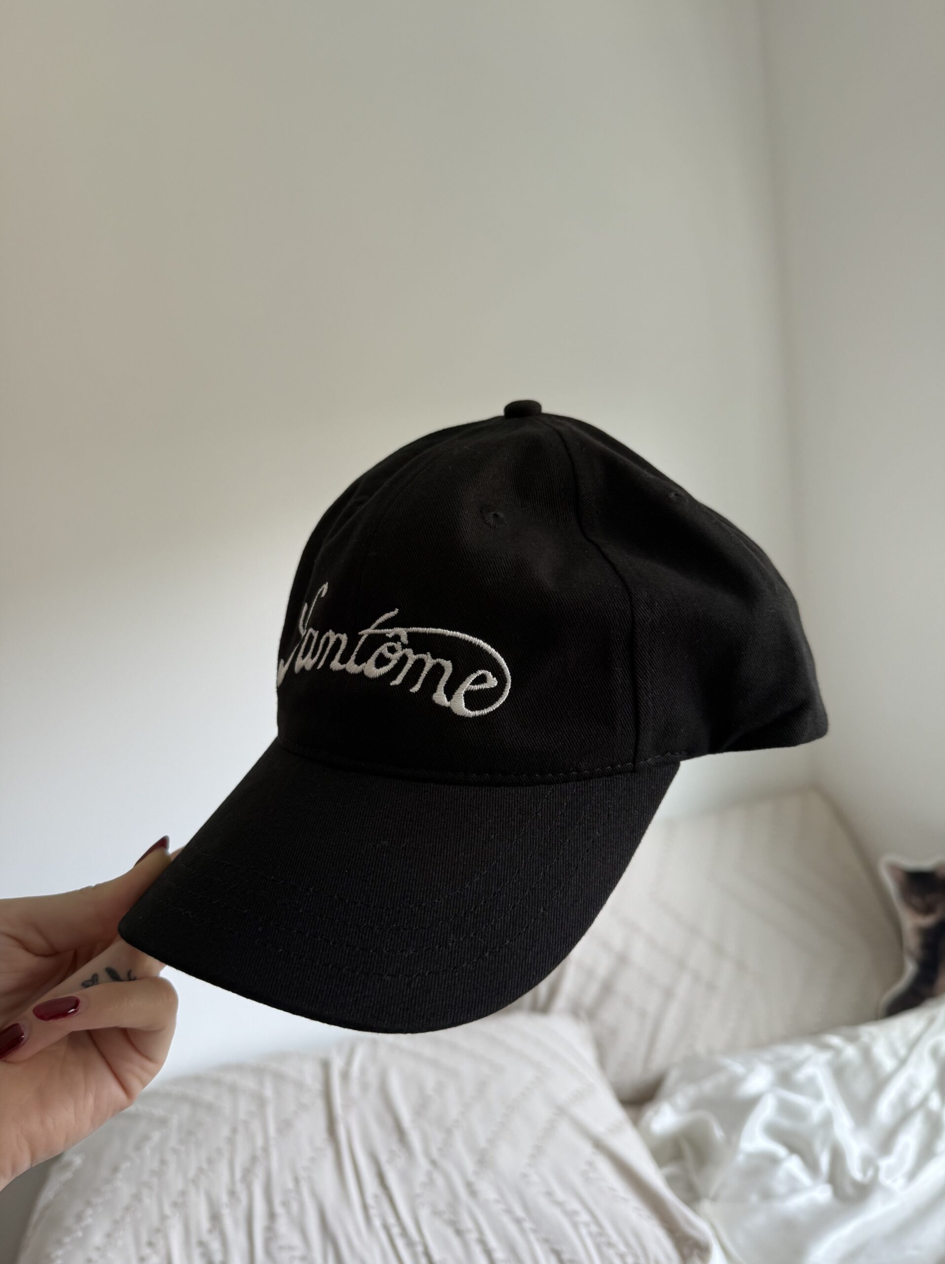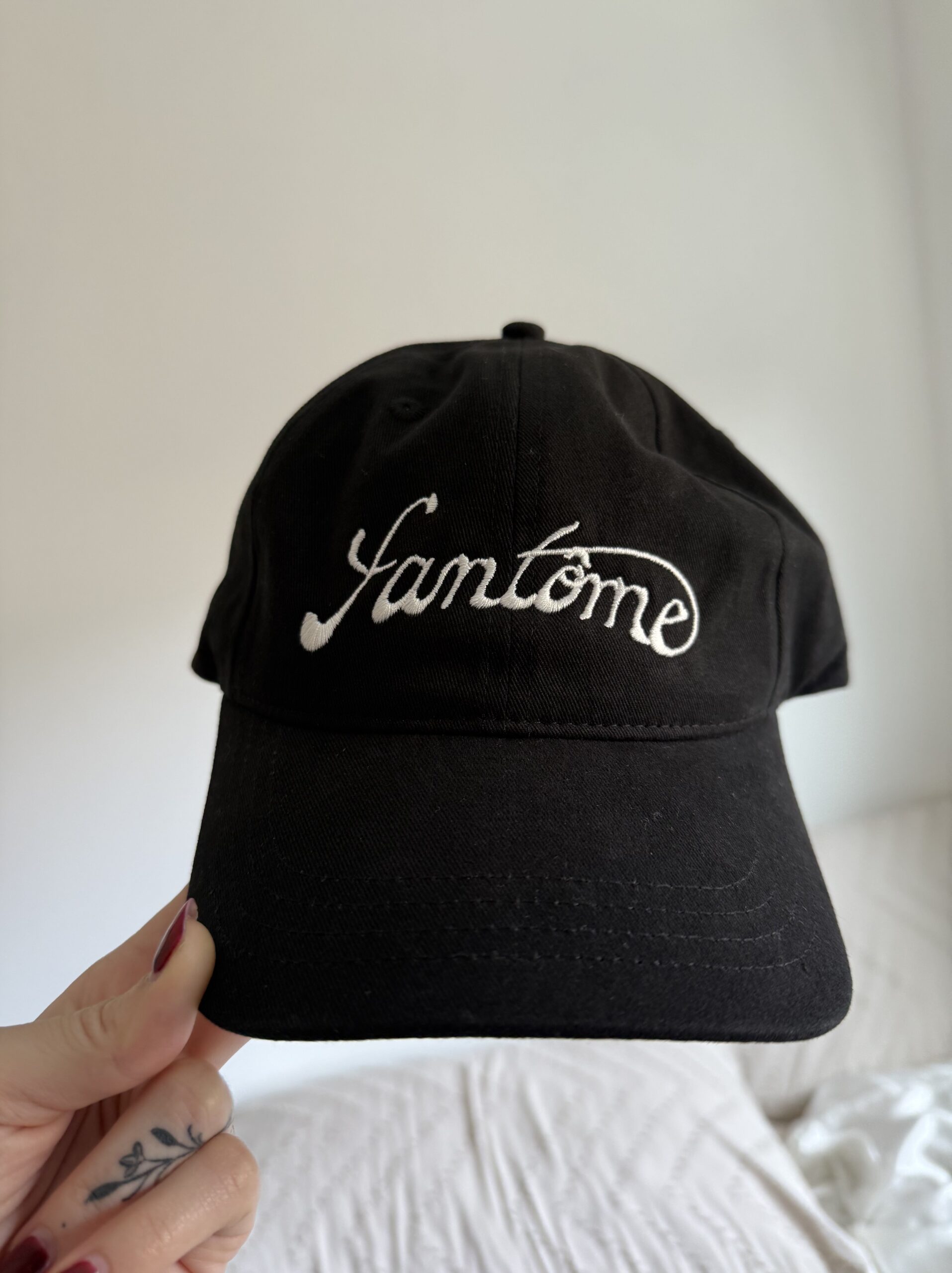 Fantome logo embroidered 2″ by 6″. White logo, black hat.